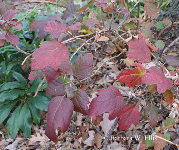 Year round, one of my favorite shrubs is oakleaf hydrangea (Hydrangea quercifolia). This dependable native brings glorious fall foliage to the garden every year, and also produces luscious white flowers in summertime. I have to say in Ohio, where I was raised, the flower buds often didn’t survive the winter, so the plants didn’t bloom. We grew it anyway just for for the deep greens of summer and the glorious fall foliage.