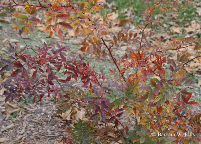 Viburnums also often bring rich foliage color to the garden, including V. carlesii, commonly known as Korean spice viburnum and the various cultivars of doublefile viburnum (Viburnum plicatum var. tomentosum). None of my viburnums are in protected locations, so winds whipped the leaves off most of them a few weeks ago. Still my Koreanspice viburnum is worth mentioning. It exhibited rich red, orange, and maroon-red foliage this fall until the most recent deluge and windstorm rendered it leafless. My plant is the relatively rare ‘Compactum’, which only grows to about 3 feet tall. Like the species, it brings incredibly fragrant white flowers to the garden in early summer.